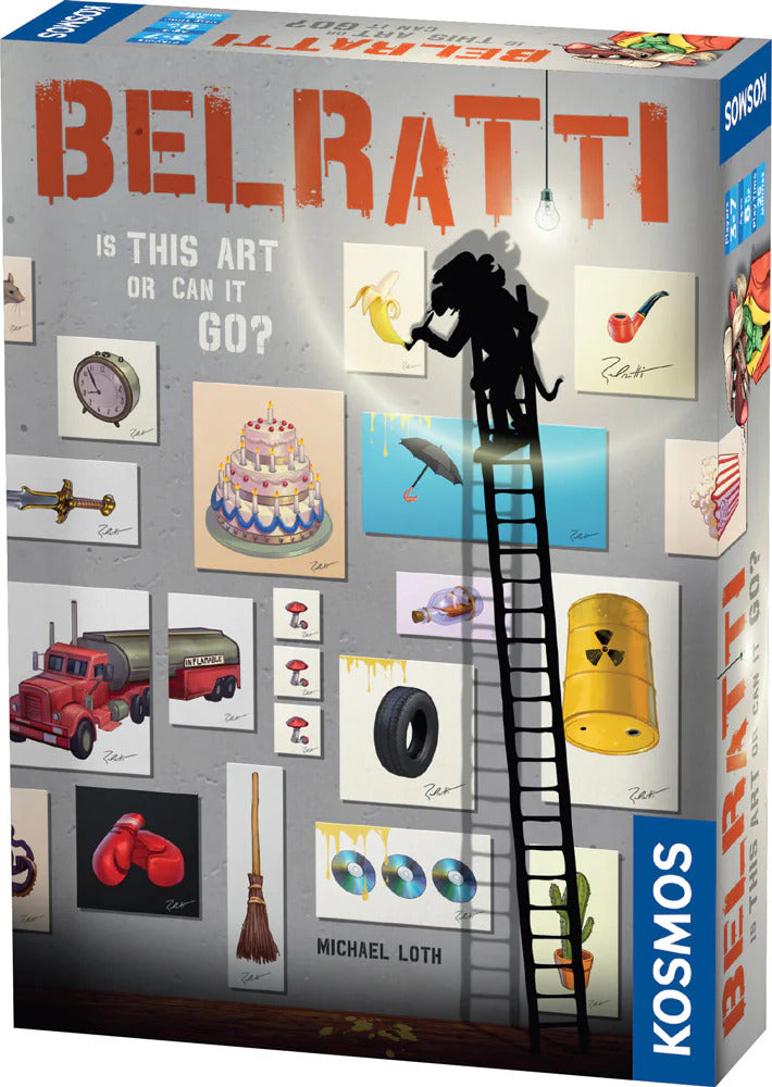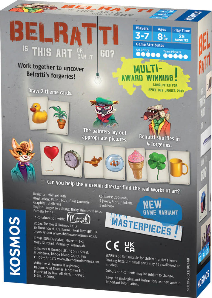 Four additional cards are secretly added to the deck – these represent fraudulent pieces from the infamous art forger, Belratti! The museum directors must guess which picture cards the painters have submitted for the exhibition and which are forgeries. Will Belratti fool them all? 192 picture cards with many possible visual associations make it a fun challenge to catch the art forger in this family game.