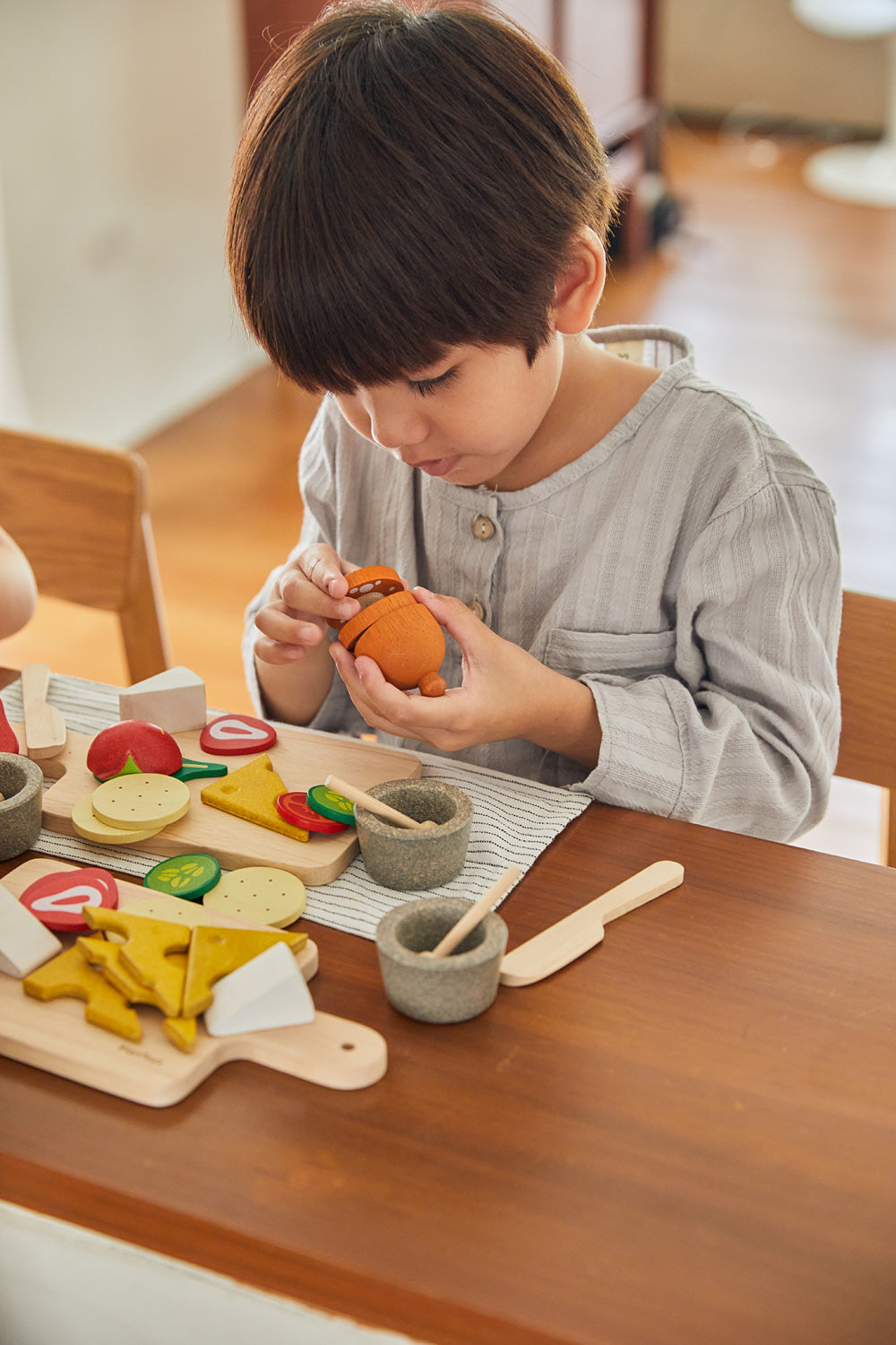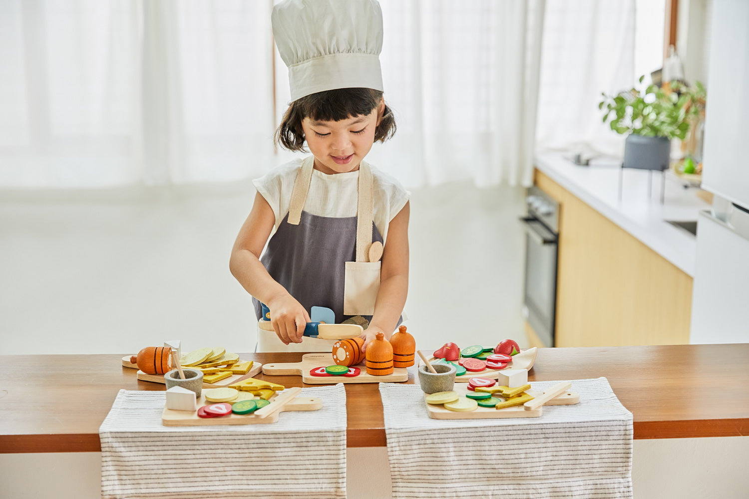 Charcuterie boards are all the rage, but how do you pronounce that word?! This "shaar-koo-ter-ee" set for kids is so cute we can't even handle it. On-trend little learners mirror parents as they lay out a spread of wooden delicacies on the serving board. Slice up the salami, arrange the cheese, crackers, cucumbers, and strawberries alongside the sauce cup and spoon, and serve with the wooden knife on display. We love that it's sustainably made in Thailand using chemical-free rubberwood, formaldehyde-free glue, organic pigments and water-based dyes.