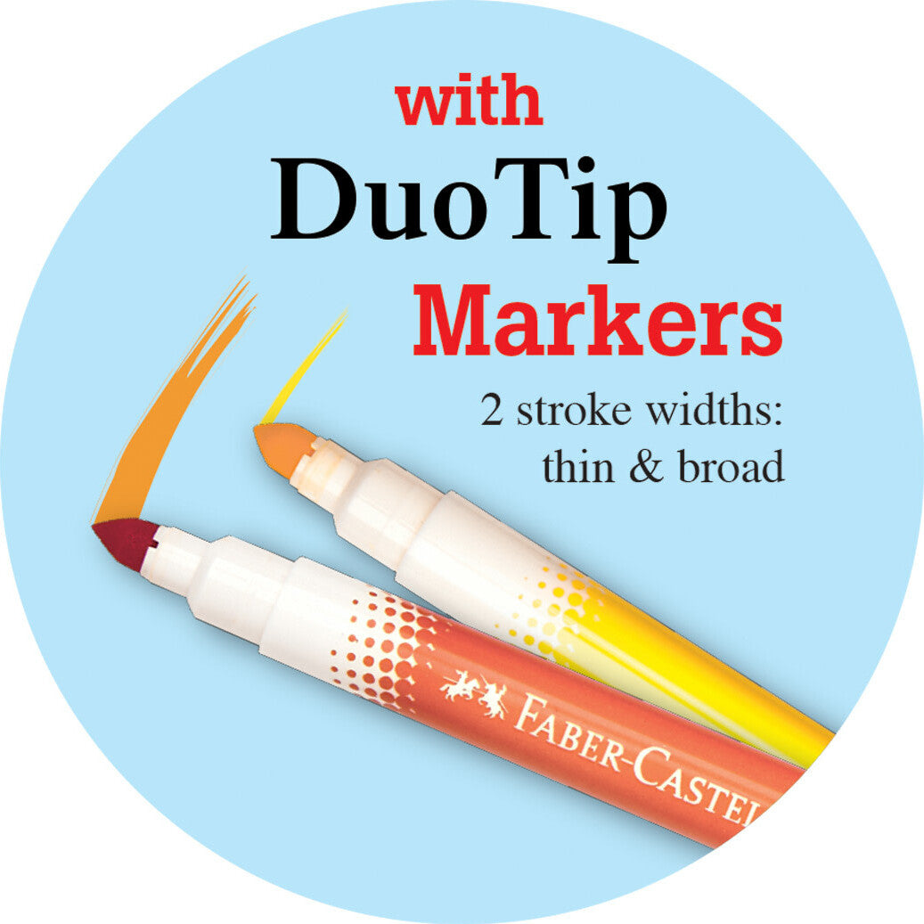 - 5 duotip washable markers – features 5 Faber-Castell duotip colored markers for twice the fun! Each marker features 2 bright, washable inks (10 colors in total)!
