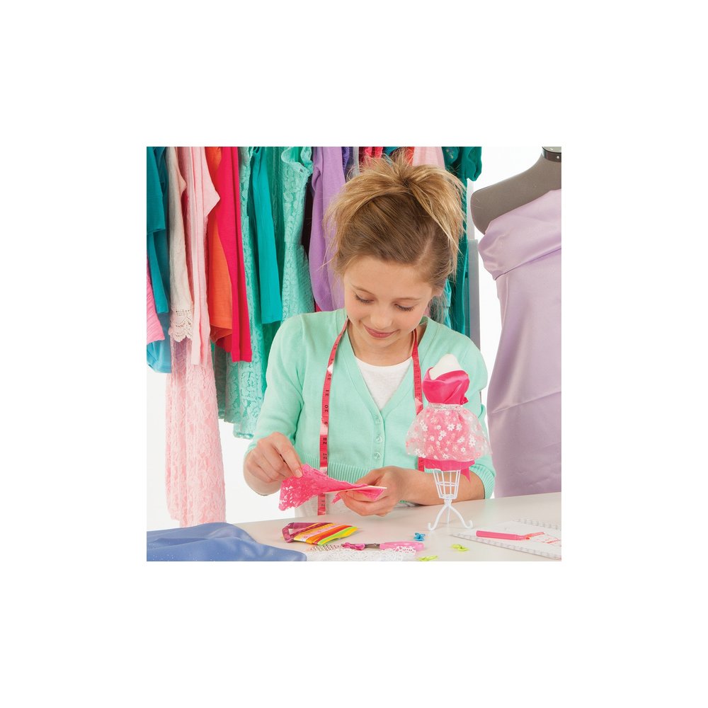 Includes trendy fabrics and accessories for fashion fun. Ultimate set contains a lace-covered dress mannequin, sewing essentials, sketch book, fabrics, swatch booklet, trims, ribbons and embellishments. 50+ pieces in all.