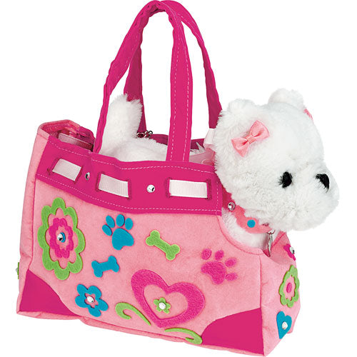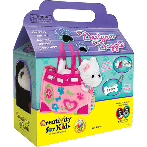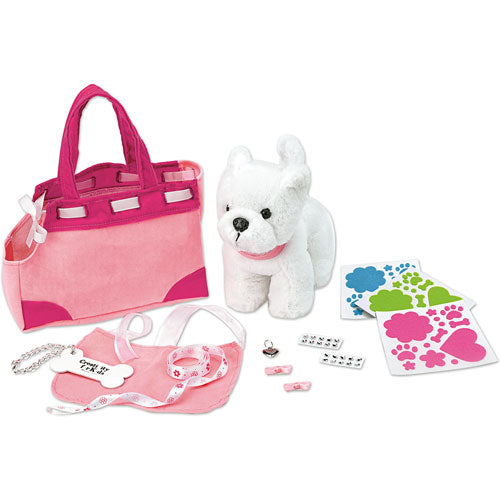 Decorate and accessorize your diva doggie's pooch purse, velvet collar, satin leash, velvet cape, satin bows and dog bone name tag. This kit is great for young crafters, as it's designed to maximize fun and minimize mess! The kit comes with everything you need to design your own doggie, and includes a velvet collar, satin leash, velvet cape, satin bows, and a dog bone name tag. You can personalize your dog tag and give your doggie a name! Use the included materials to decorate the puppy carrier purse, cape, and collar, so when you're finished, you can take your dog wherever you go! Quick and easy peel-and-press felt accents and rhinestones means no glue or scissors are needed. Dog measures 6-1/2" x 6". Purse measures 7" x 5" x 2-1/2".
