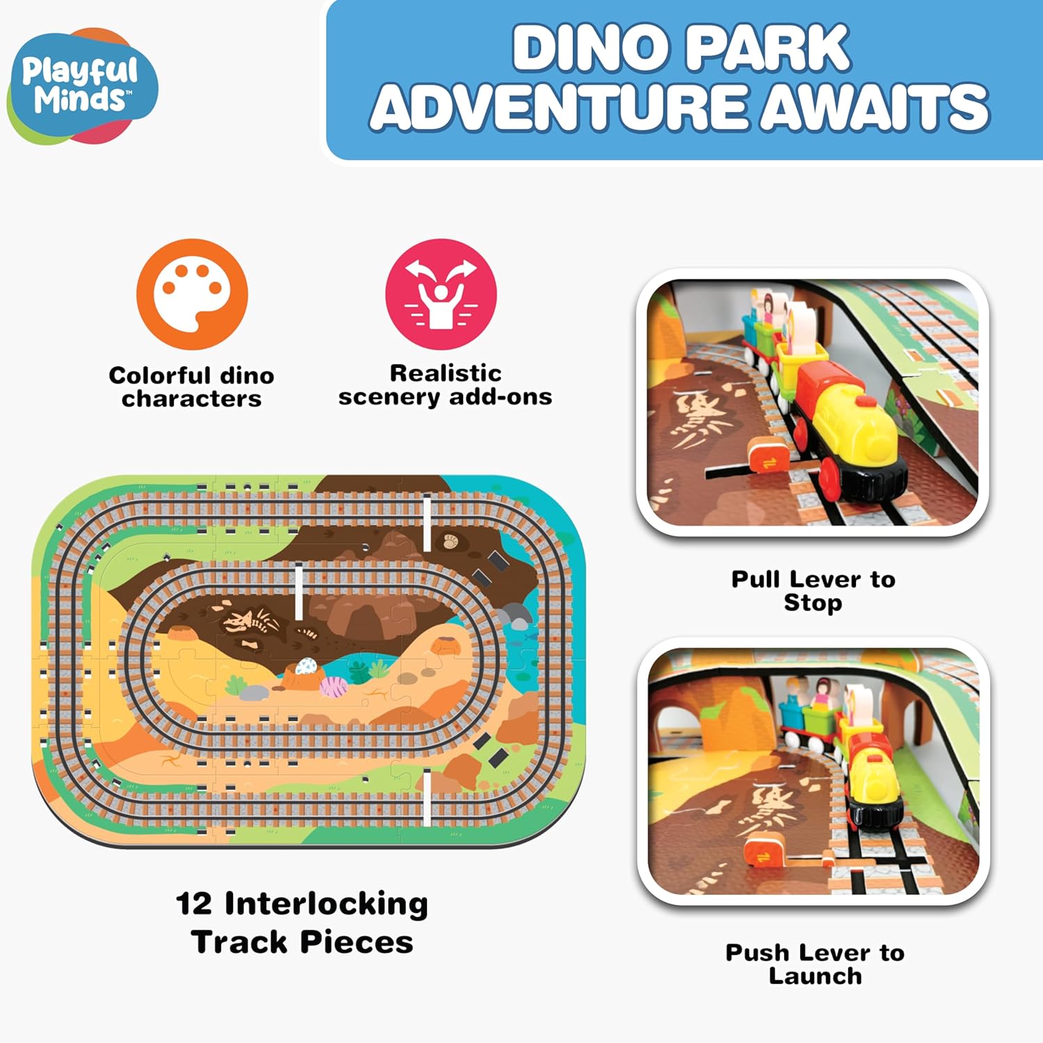 All aboard for dino-sized fun with the Playful Minds Dino Park Train Puzzle Playset! This 60-piece build-and-play railway set is perfect for toddlers and preschoolers. Designed with soft, durable EVA foam puzzle pieces, kids can easily assemble the interlocking track in two different layouts. The battery-powered train engine automatically picks up its magnetic cars as it travels the track—no frustration, just fun. Includes 4 kid characters, colorful dinosaurs, track supports, and terrain pieces for a full adventure experience. The train stays on the track and is ready to loop again and again. Great for developing fine motor skills, problem solving, and creative storytelling. Safe for kids ages 3 and up.