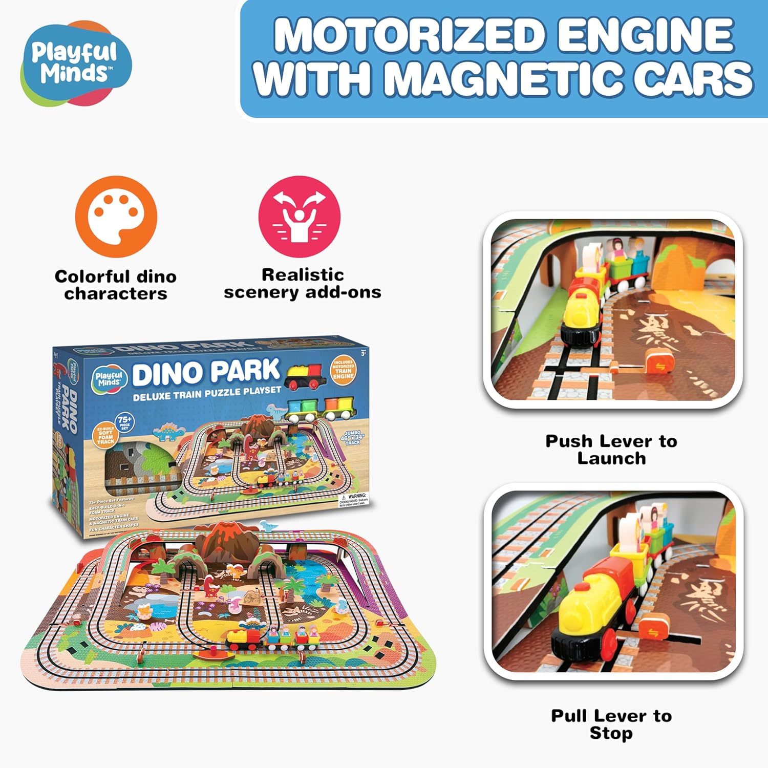 All aboard for dino-sized fun with the Playful Minds Dino Park Train Puzzle Playset! This 75-piece build-and-play railway set is perfect for toddlers and preschoolers. Designed with soft, durable EVA foam puzzle pieces, kids can easily assemble the interlocking track in two different layouts. The battery-powered train engine automatically picks up its magnetic cars as it travels the track—no frustration, just fun. Includes 4 kid characters, colorful dinosaurs, track supports, and terrain pieces for a full adventure experience. The train stays on the track and is ready to loop again and again. Great for developing fine motor skills, problem solving, and creative storytelling. Safe for kids ages 3 and up.