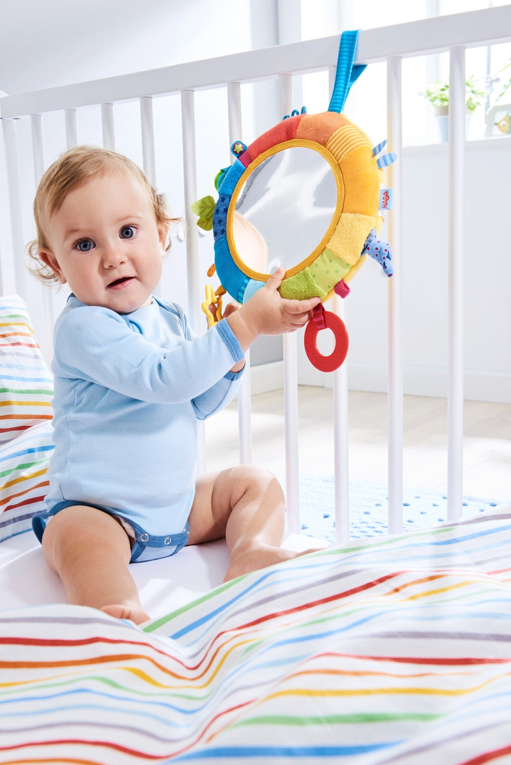 - Whether used to admire their reflection in the mirror film, explore exciting elements like tags, loops, rings and crinkles with their fingers, teeth on the teething ring or simply lay on the backside as a pillow, babies have everything they need in the Rainbow discovery mirror.