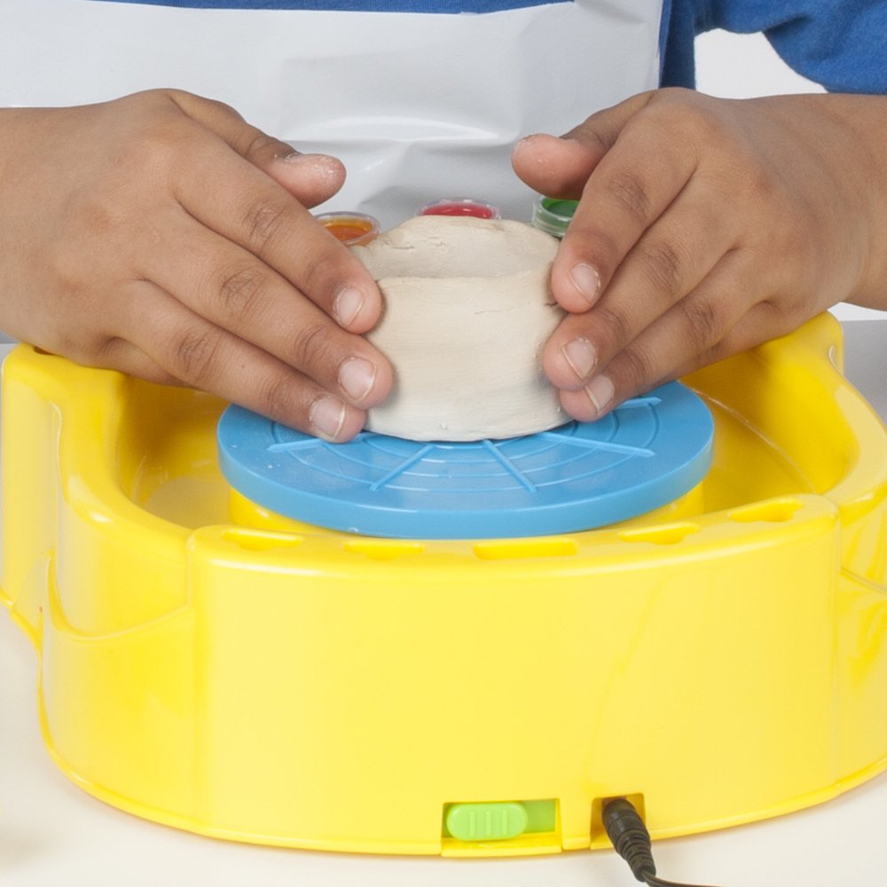 Contents Include: 3 lbs of Air-dry Clay, 6 Piece Tool Set, 1 Craft Apron, 1 Table Cover, 12 Pots of Acrylic Paint, Glaze, 1 Sponge, 2 Paint Brushes, Illustrated Instructions and Ideas Booklet Foot pedal operation requires 4 C batteries - not included