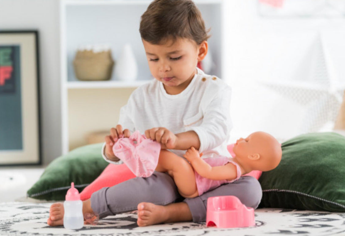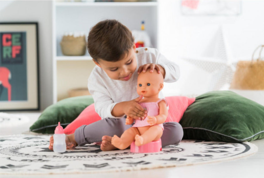 Baby Emma Drink & Wet Bath Baby Doll by Corolle is a 14-inch all-vinyl baby doll that drinks, wets and loves to take a bath! And because she is anatomically correct, Emma is an excellent potty training aid, too. She is dressed in an undershirt and underpants and comes with her own color-matched potty, pacifier, and feeding bottle.