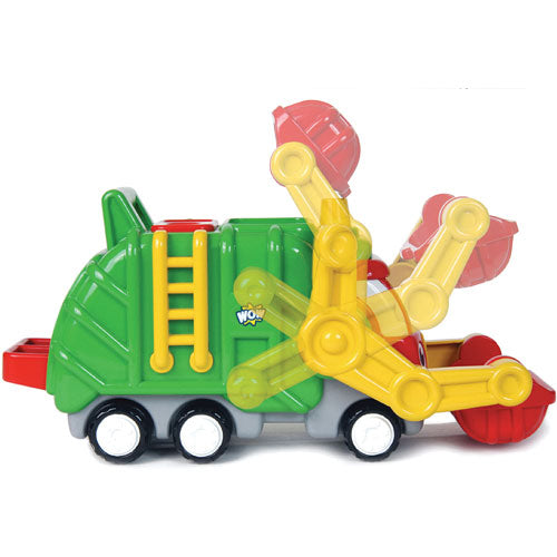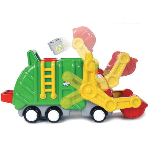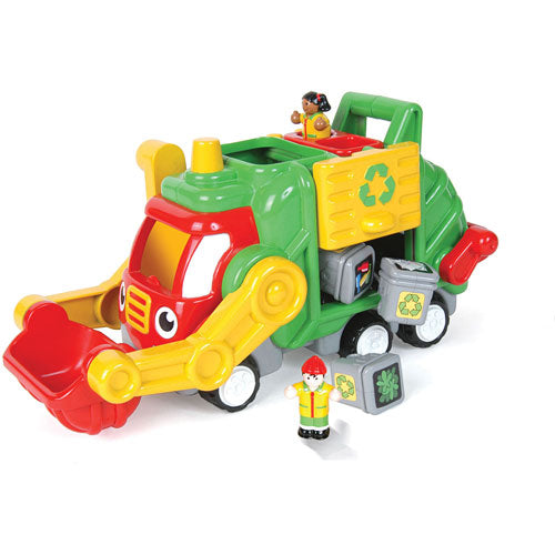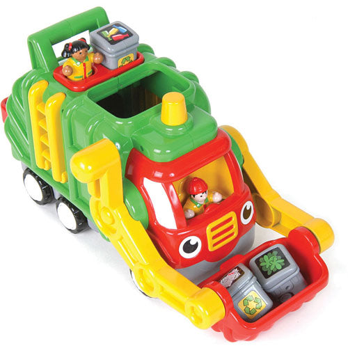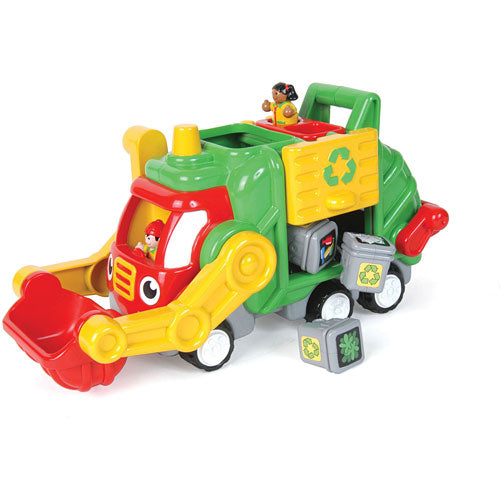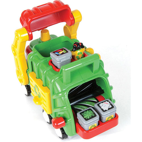 Recycling has never been so much fun! Fred is your friendly recycling truck. Use his bucket to tip trash into the truck or sort the bins and flip them into the rear. Drive off using his powerful friction motor with realistic engine sounds. Watch the automatic trash crusher spin and then slide open the clicking door to empty the truck. Three different recycle bins, a boy and girl recycling team and a sturdy carrying handle complete this great role-play set.
