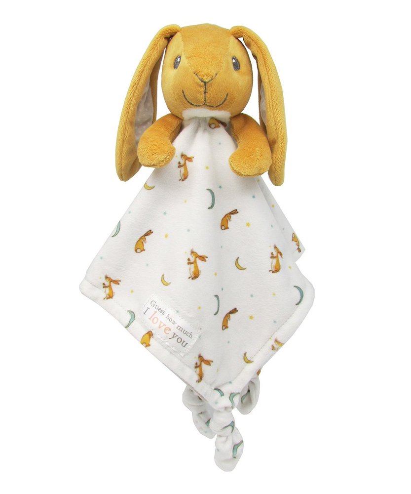 The Guess How Much I Love You™ Snuggle Blanky features the beloved Nutbrown Hare from the classic children's book from Sam McBratney. Your little bunny will love to cuddle and snuggle with this part-plush, part oh-so-soft cream blanky featuring the phrase "I love you right up to the moon and back" embroidered below the sweet bunny. The blanket itself is edged with silky green satin trim, and has a bunny print on the underside. The Snuggle Blanky is 100% machine-washable, and suitable for newborns and older.