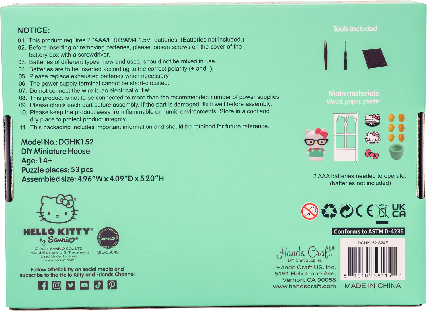 Introducing a satisfying new DIY activity for teens who enjoy focused crafting! Perfect for Hello Kitty fans and creative crafters, this kit provides hours of fun as you assemble this highly detailed miniature bookstore, filled with tiny books, adorable gifts, and colorful gift bags. Once completed, you'll be enchanted by the cozy LED-lit interior and a cute, pint-sized, Hello Kitty figurine, ready for endless hours of play and imagination. A memorable gift that wows, and the finished piece makes a wonderful display for any bookshelf. Requires 2 AAA batteries, not included.