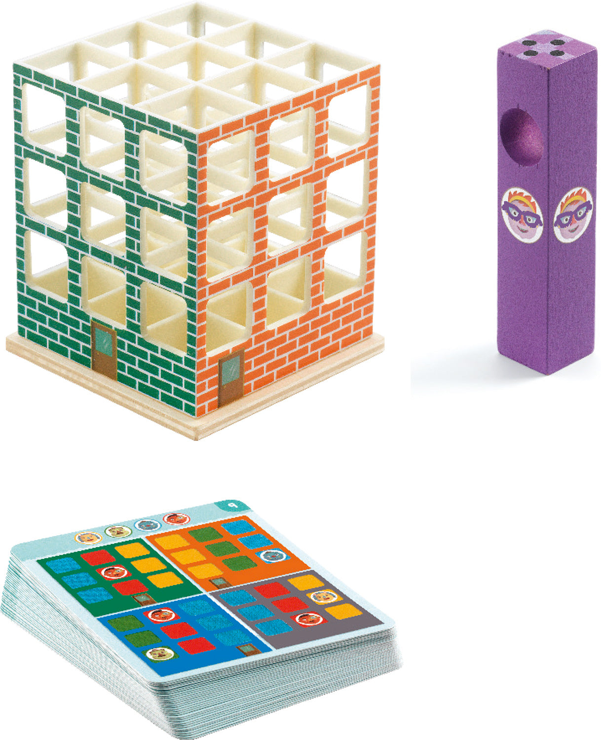 How will you place the demanding guests in your hotel so everyone gets the view they want? It's up to you to find the only solution to each challenge and keep all the guests happy! Follow the patterns on the clue cards to figure out which of the colored blocks to place in which column of the hotel building so that the guests look out through the correct windows. With only one possible solution for each of the 60 challenges, kids and adults enjoy this 3D logic game! Includes: 30 cards, 1 plastic cube on a wooden base, 6 wooden blocks and 1 set of game rules in 10 languages.