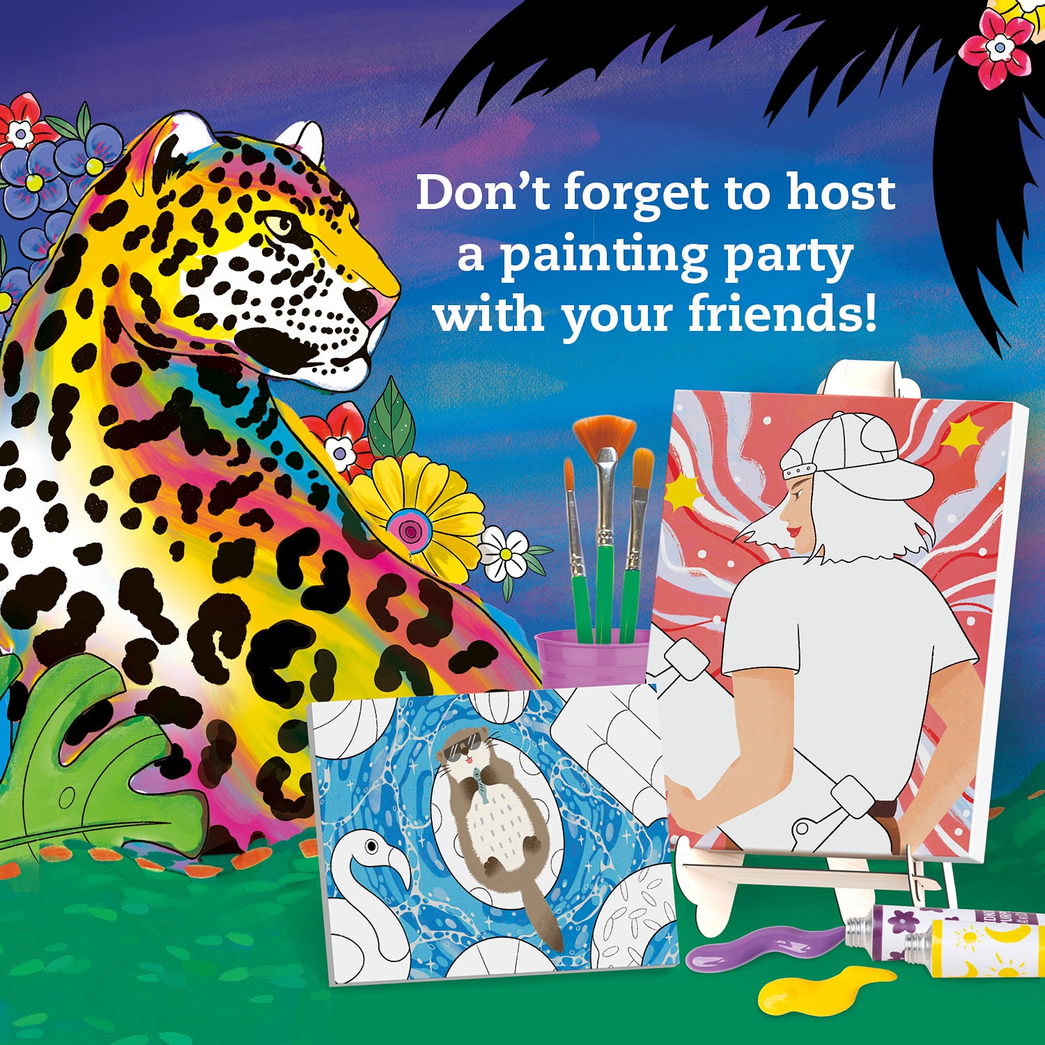 Host a painting party with friends! This kit is like Bob Ross in a box: aspiring painters gain confidence as they follow the clear instruction book to learn fun painting skills. Creative kiddos paint and embellish on 18 sheets of canvas paper printed with trendy themes like tropical birds, groovy beach sunsets, and an octopus that's hungry for ice-cream. Includes tiny easel, 6 tubes of acrylic paint, a palette tray for mixing, 3 unique brushes, a flexible palette knife, and 3 blank canvas panels.