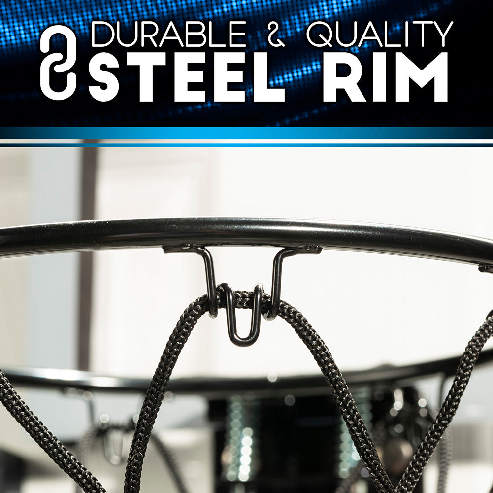 Practice your basket-shooting skills when going outside isn't an option. Just hang the backboard over the door, flip on the cool LED lights, and take your first free throw! At 18" x 12", it installs easily on almost all standard doors, plus it's designed with built-in cushioning to protect your doors from damage. Includes a 5" rubber basketball with an easy-grip, textured surface, plus a pump. Requires 3 AAA batteries, not included.