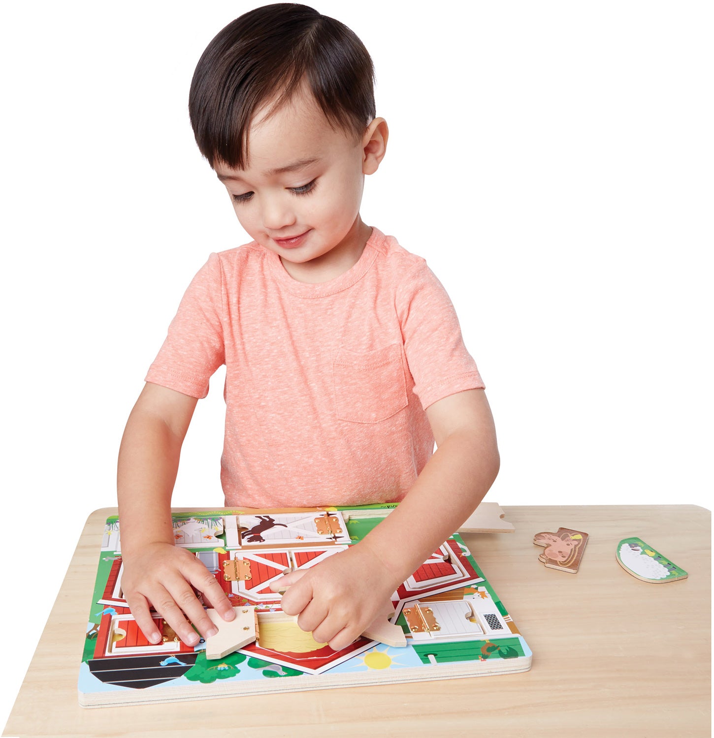 Here a chick, there a chick...behind each of the 9 hinged doors on this charming barnyard scene is a delightful, magnetic animal. Learning about animals while improving memory and fine motor skills will keep children busy and having fun on the farm for hours!