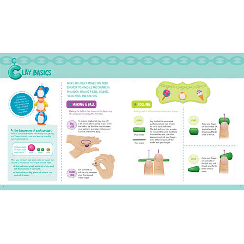 Make Clay Charms features simple step-by-steps for more than 35 designs-cute fruit, adorable animals, sweet treats, and tons more. Make them, bake them, add shine (with our specially formulated glaze), and then attach your creations to the included bracelet.