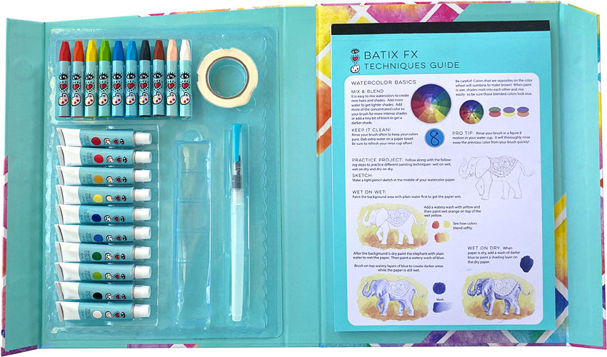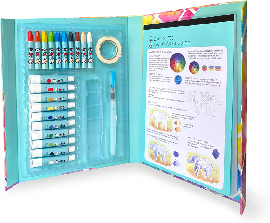 The traditional technique of wax resist requires a palette of artistic curiosity. This pack includes everything from watercolors to pastels, art pad to instructions, that show you how to produce your own multimedia art. It comes with 10 watercolor paint tubes, 12 oil pastels, water brush pen, masking tape, pallette, and a 25-page art pad, all in a high-quality binder with a magnetic closure. The Technique Guide will help you get the coolest effects as you learn to mask off areas of the page, paint over the areas and reveal the design underneath.