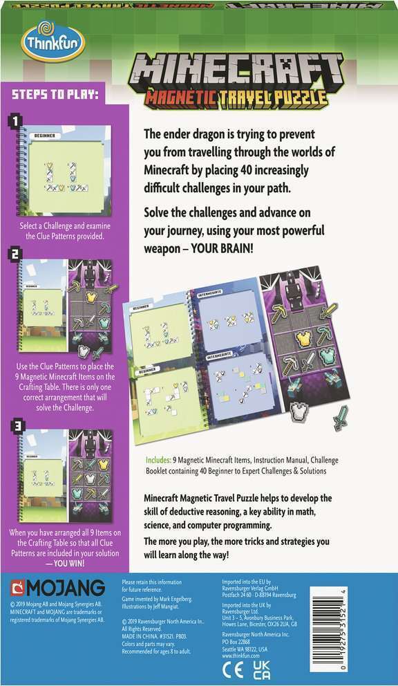 - What you get - the Minecraft magnetic travel puzzle includes 9 magnetic Minecraft items, an instruction manual, and a challenge booklet containing 40 beginner to expert challenges and solutions.