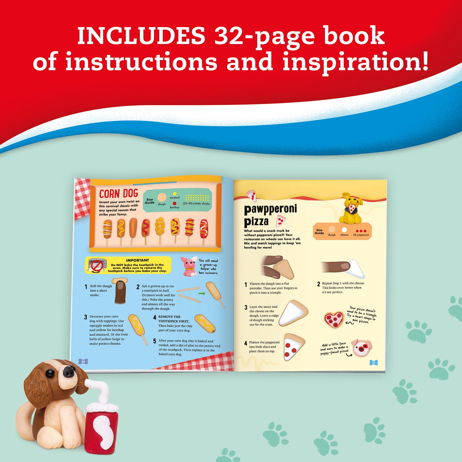 Tweens and teens build confidence as they sculpt a variety of clay dogs with artisanal clay doggie treats! The 32-page illustrated instruction booklet inspires imaginations and encourages creativity. After crafting, they can build and decorate a colorful food truck for the pups and enjoy hours of storytelling play. This kit includes five colors of clay for such pun-tastic, puppy-fied treats as pawpperoni pizza, pupcakes, and more!
