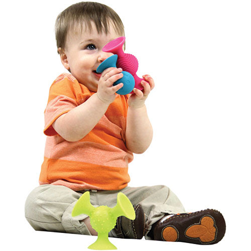 Our set of three little suckers works as a suction toy on strollers, high chairs and in the bath. Babies delight in the movement, sound and texture, encouraging exploration and sensory awareness.