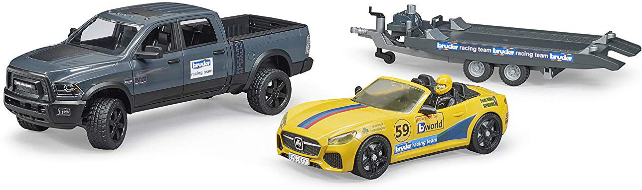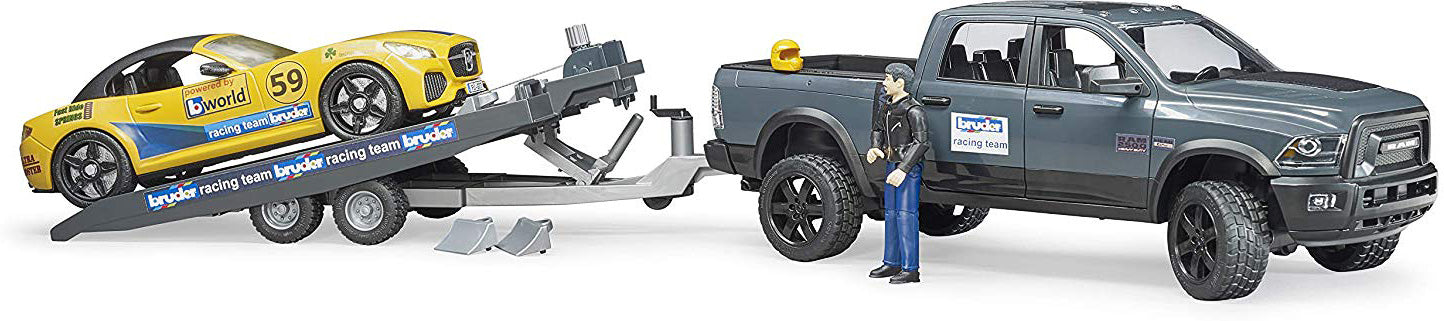 Old and young are both fascinated by motorsports. No surprise there with these levels of excitement, thrill and fast sports cars. BRUDER is also not immune to this fascination. With the RAM Power Wagon including tuned Bruder Racing Team sports car there is a new, exciting vehicle and trailer for the bworld leisure themed world. The RAM Power Wagon is full of power with an output of up to 410 hp and all-wheel drive to take the racing car to the race track with ease. All four doors of this pick up truck open and the tried and tested steering wheel extension means the vehicle can be easily manoeuvred.