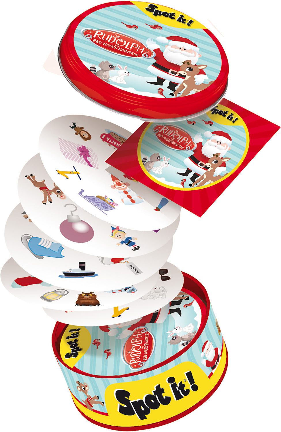 Great bouncing icebergs! Get ready for magical winter wonderland family fun in this game that requires attention to detail and quick thinking. Be the first to spot the single image match between two cards to win the round. Featuring all the characters from the North Pole including Rudolph, Santa Claus, Yukon Cornelius, Bumbles and many more. In this fun card game, there is always only ever one matching symbol between any two cards. Spot it first, and you win! For 2-8 players.