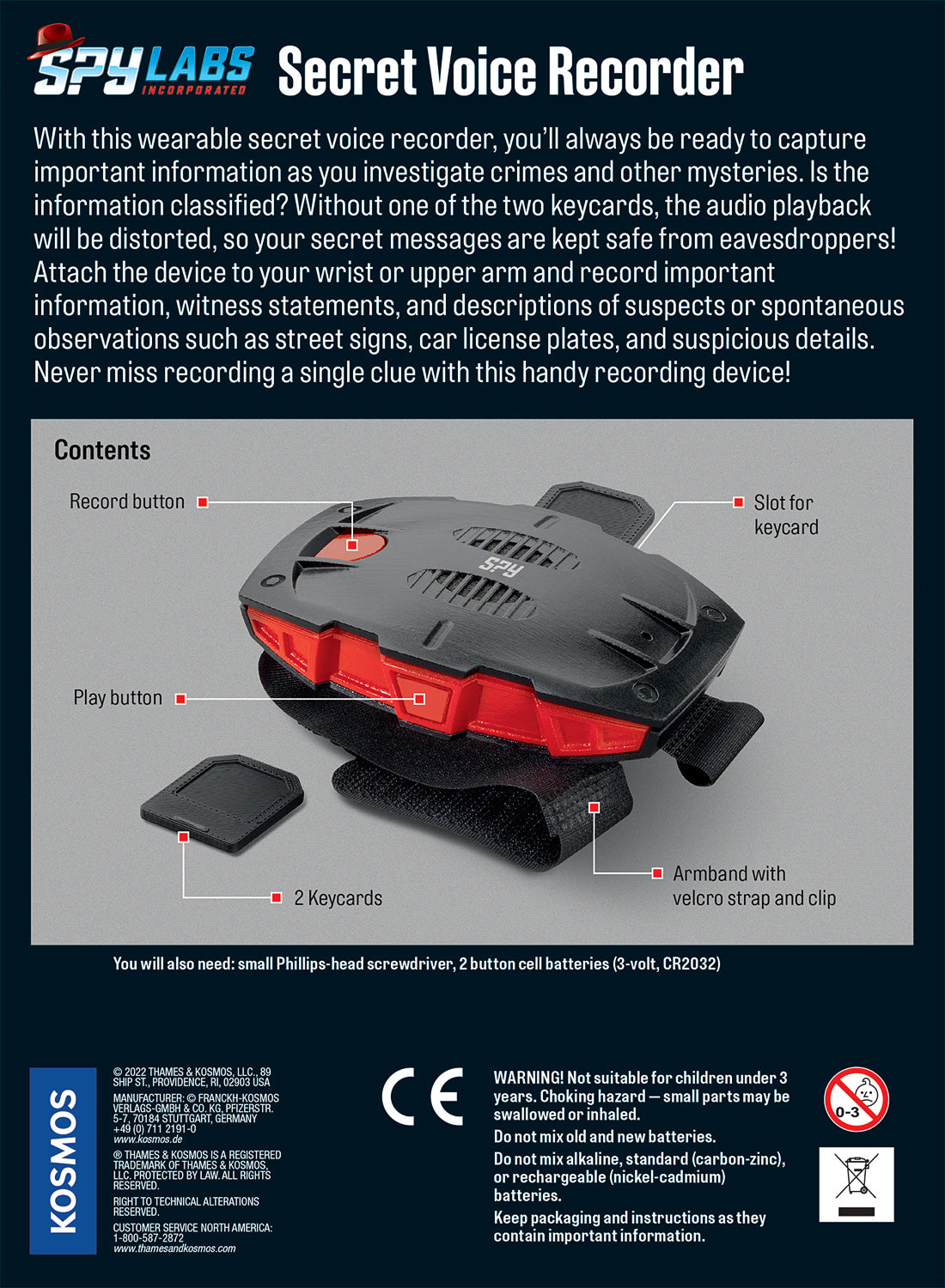 If you're raising a future James Bond or Sherlock Holmes, your young secret agent needs the high-tech help of a secret voice recorder. Spies strap this device to their wrist or upper arm to record information on the go. Messages stay distorted and secret from eavesdroppers unless one of the two keycards is used to decrypt them! Record up to 60 seconds of clues, witness statements, or suspicious details. Requires 2 CR2032 coin cell batteries, not included.