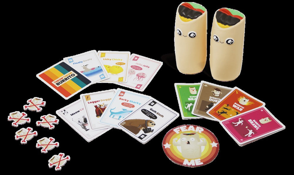 - Includes 120 cards, 7 tokens, and 2 foam burritos soft enough to throw them at your Great-great Auntie Marlene without having to feel guilty