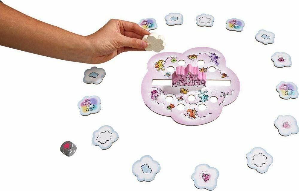 Ages: 4-7 Players: 1-4 Game Length: 15 minutes The five little unicorns Glitterluck, Rosalie, Marvel Flower, Magic Swirl, and Stardust live in a beautiful cloud castle. Every day, friends come to visit them; there are always many visitors and a lot going on and the castle is running out of space. Using many clouds and a little bit of magic, the unicorns gradually add more turrets to their castle. The object of the game is to collect the 10 pink crystals, stack the clouds and the unicorns on the castle in order to house all the unicorns in their new home!