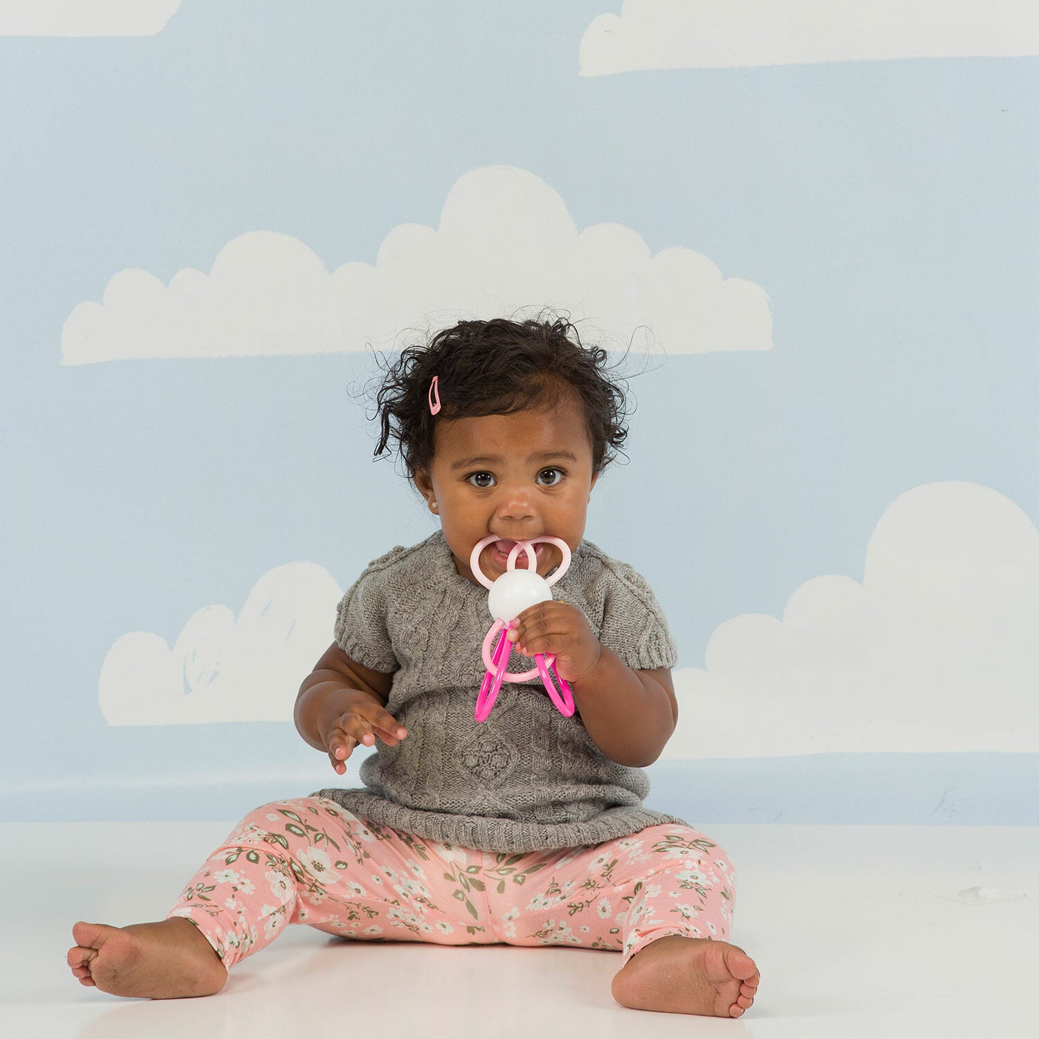 The Zoo Winkels Rabbit features the same colorful, chewable, bendable loops as the original, which make it easy for infants to grasp and explore. The appeal of the Winkel teething toy spans and enhances developmental stages including grasping, tracking, mouthing, and throwing. A soft rattle makes it fun to shake, too. Place the Winkel Rabbit in the fridge to cool, once chilled offer it up to baby as a cool and soothing teether.