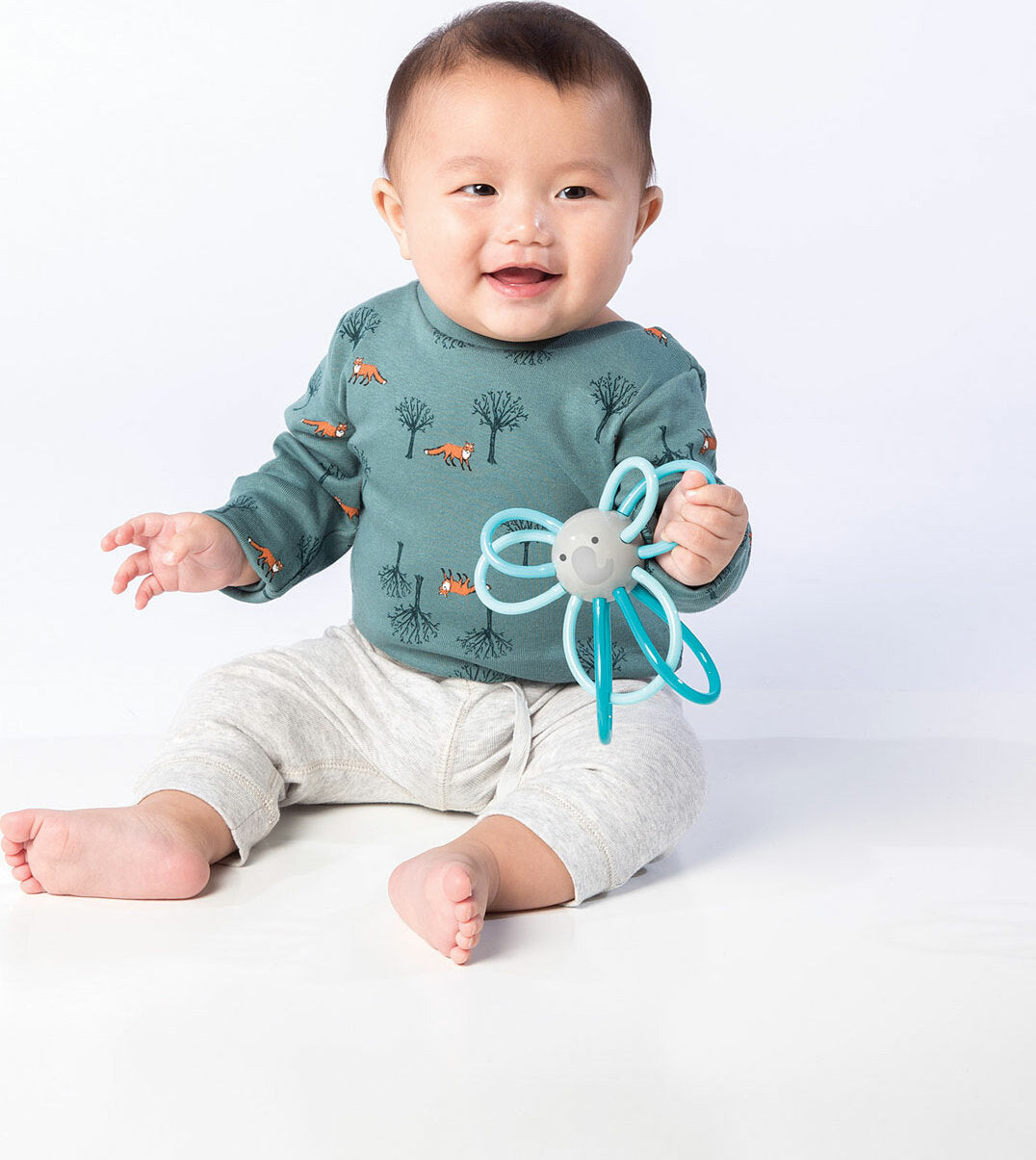 The Zoo Winkels Elephant features the same colorful, chewable, bendable loops as the original, which make it easy for infants to grasp and explore. The appeal of the Winkel teething toy spans and enhances developmental stages including grasping, tracking, mouthing, and throwing. A soft rattle makes it fun to shake, too. Place the Winkel Elephant in the fridge to cool, once chilled offer it up to baby as a cool and soothing teether.